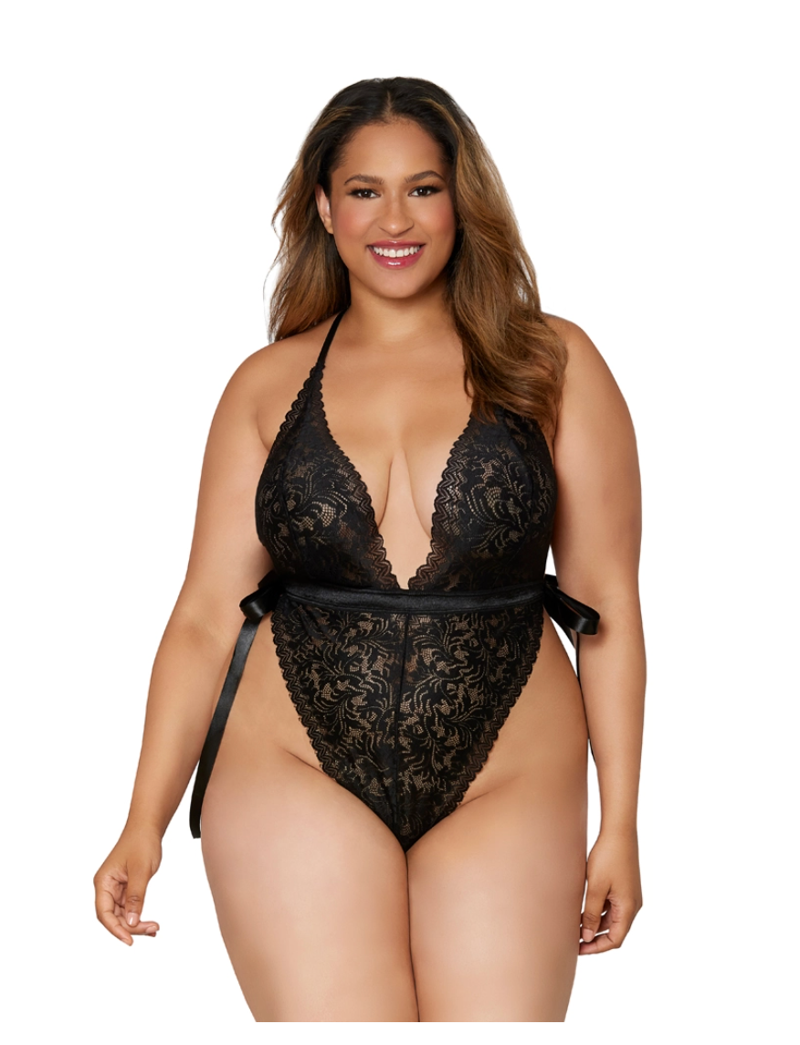 El placer está alrededor de cada hermosa curva. Este teddy de cuello pronunciado presenta cierres de lazos de satén laterales y detalles de tiras. Los tirantes ajustables se unen en la espalda con un anillo decorativo. El color negro es sensual y seductor, acentuado por el patrón de hojas en espiral del material de encaje suave.