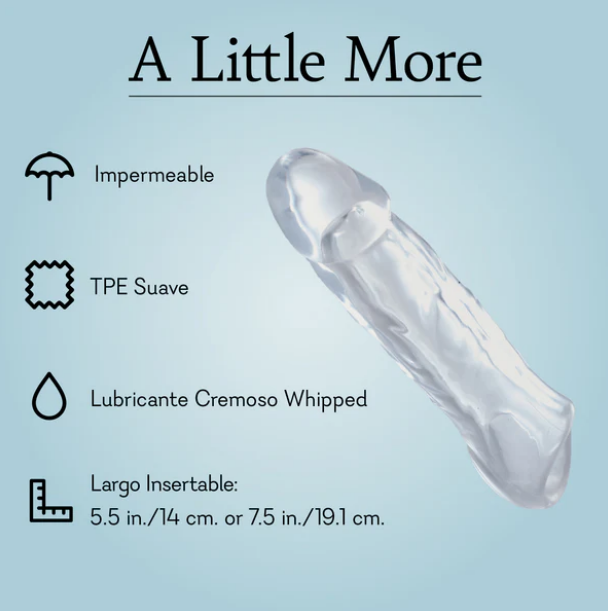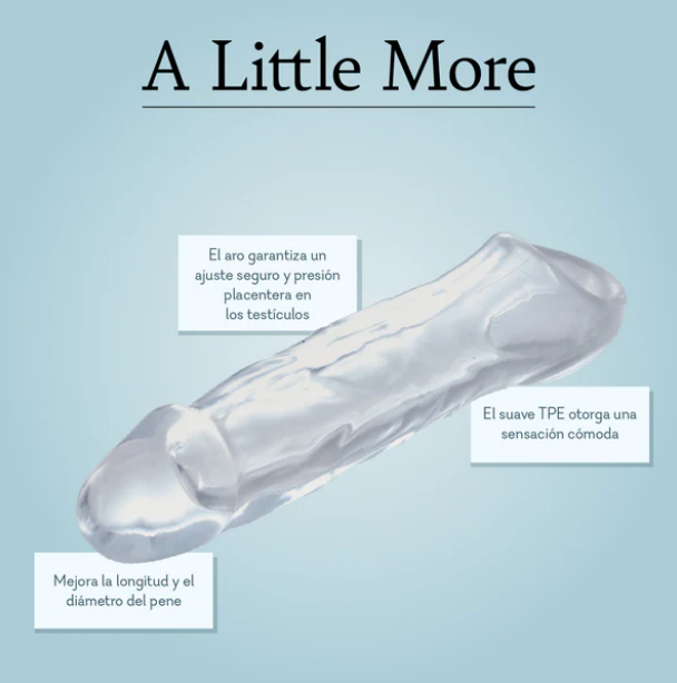 ¿Buscas un poco más? Mejora tus aventuras en el dormitorio con este extensor de pene de 19 cm (7,5") . Fabricado con TPE supersuave, A Little More añade longitud y circunferencia a tu pareja para ayudar a llevar las cosas al siguiente nivel. Solo aplica un poco de lubricante cremoso en el interior del juguete y deslízalo hacia adentro, tirando del lazo detrás de los testículos para mantener el extensor en su lugar. Después, aplica cualquier lubricante en el exterior del extensor... y disfruta.